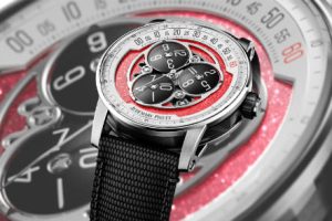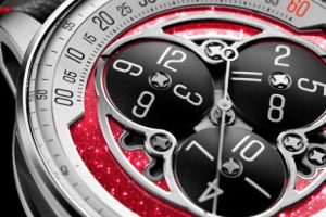 The Starwheel SG60 is primarily inspired by the national colours of Singapore, which are white and red. The dial base is finished in a red lacquer that incorporates a sparkly texture, while the chapter rings around the dial are silvered instead of the standard black.
